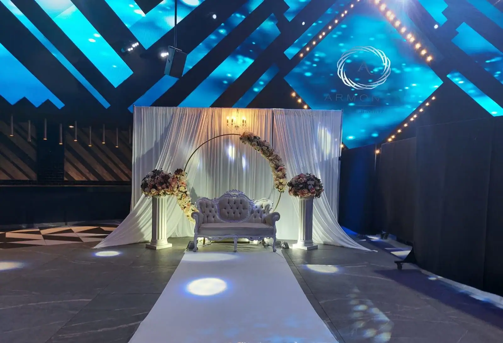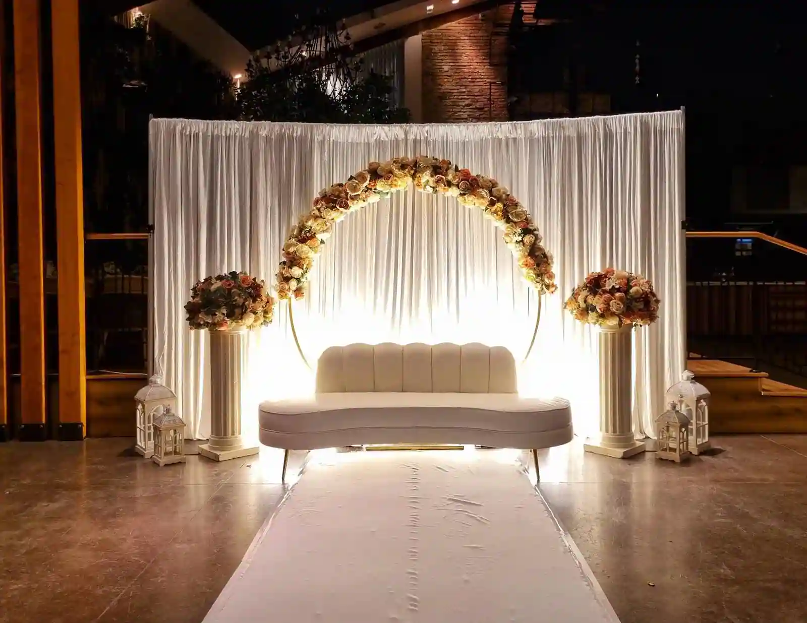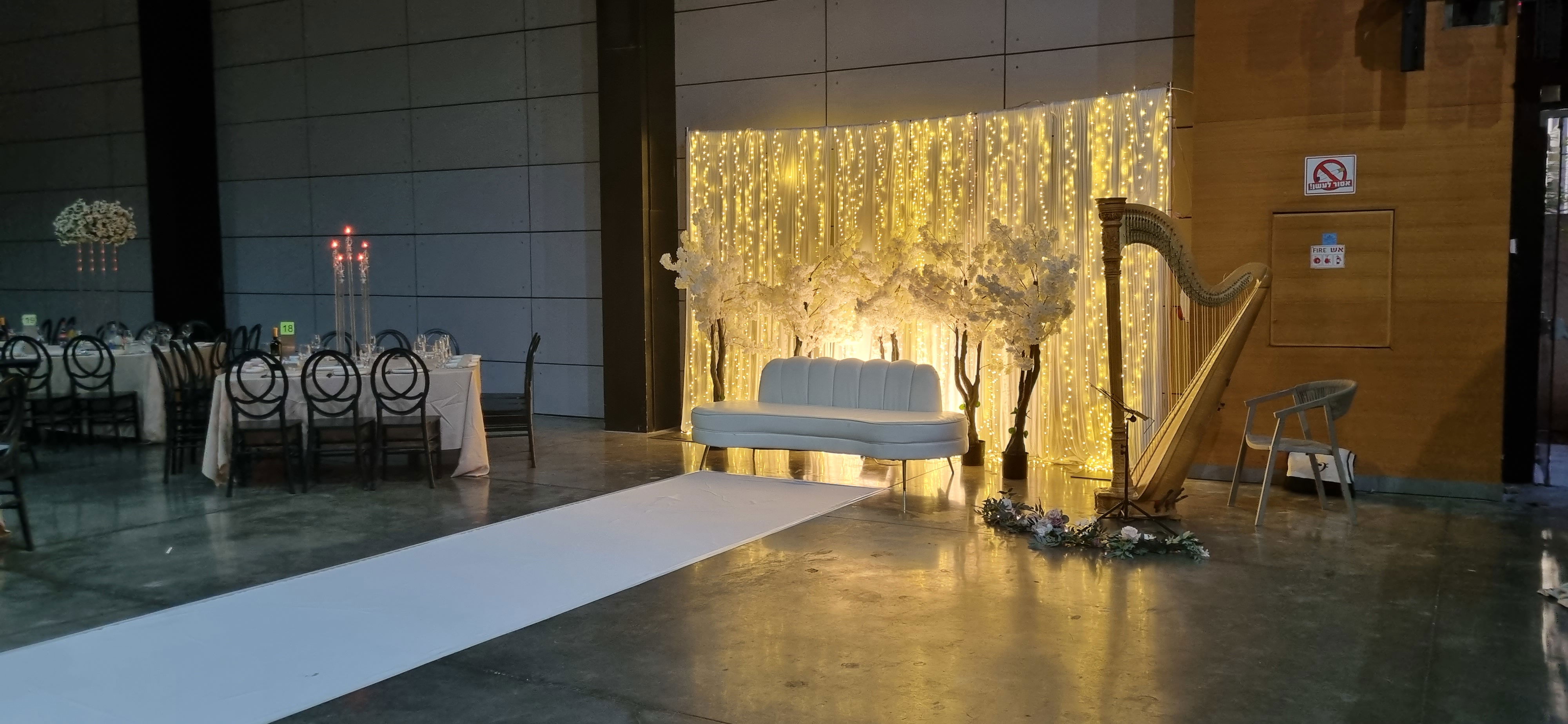 ביום האירוע נגיע בזמן שקבענו, נקים את כל מערך העיצוב – כסא הכלה, שביל, תאורה, וילונות, פרחים, אלמנטים עיצוביים – לפי הדגם שבחרת.