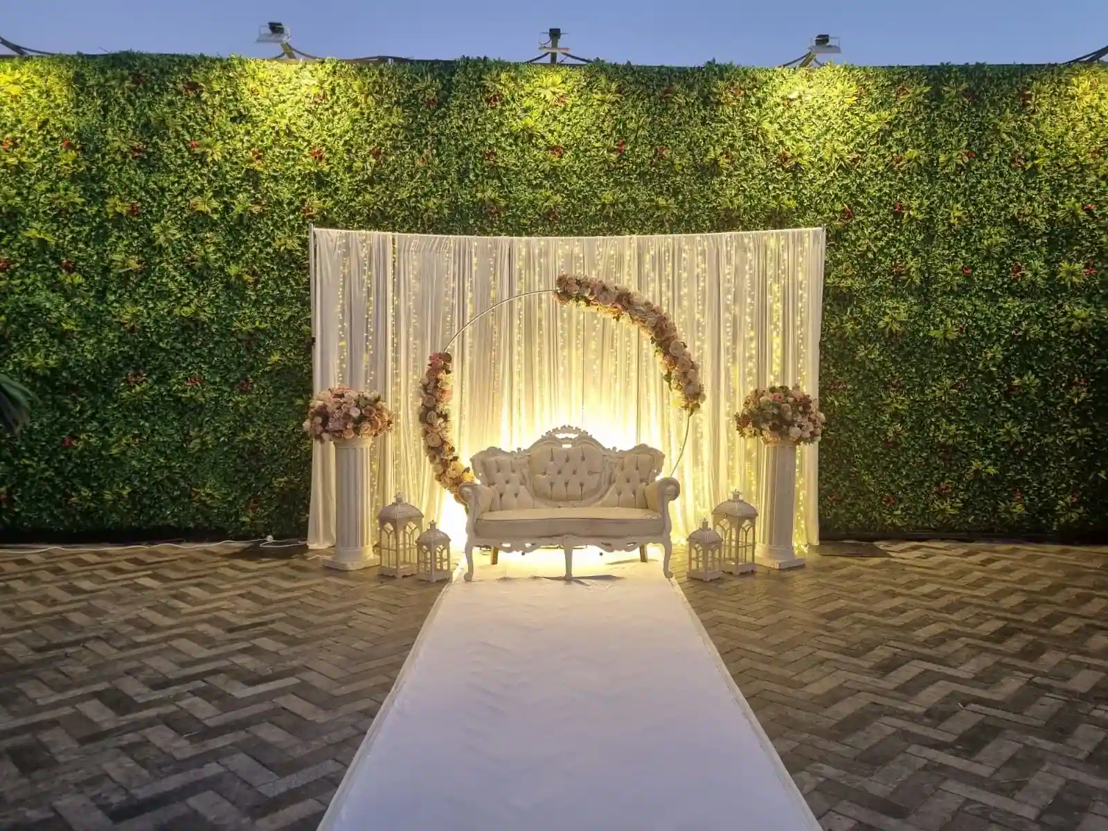 | דגם שערים | 2,800 ₪ | כסא לואי, שערים עם פרחים, 4 מעמדי זהב עם זרים, תאורת לד, וילון ושביל לבן |