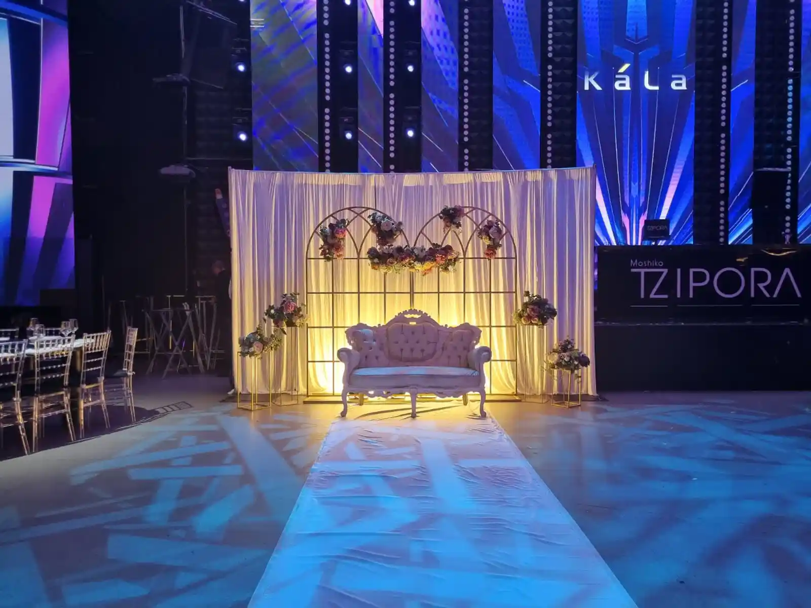 עיצוב הכולל כסא לואי מוזהב או לבן, רקע וילון לבן, עמודים עם פרחים בגווני פסטל, תאורה רכה – והכול מוקפד, סימטרי ומלכותי.